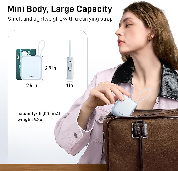 - COMPACT&PORTABLE: This power bank usb c fast charger measures just 2.9 x 2.5 inches (credit-card size), offering a more compact overall footprint at only 176g. Its thoughtfully thicker build (1 inch) delivers greater capacity and rugged durability, while enhancing grip comfort. With a built-in cable and sleek design, this power bank with cable slips effortlessly into any pocket,Perfect for daily commutes, travel, or outdoor adventures,quickly powers up your phone.