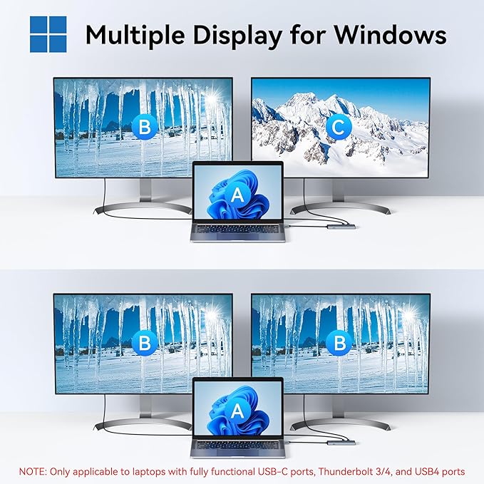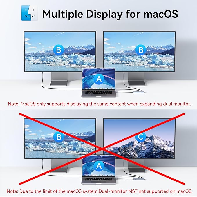 - MST/SST USB C Splitter for Windows: This USB C video hub supports MST/SST dual-display modes exclusively for Thunderbolt 4/USB 4 Windows laptops, enabling 4K/60Hz on two USB C monitors. MST functionality is not supported on macOS systems