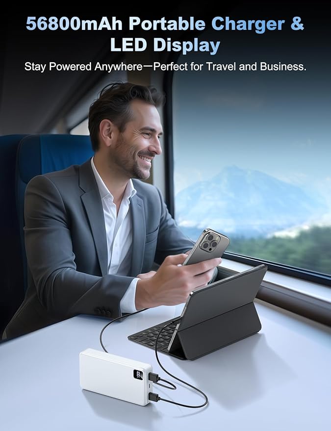- Massive 56800mAh Capacity – Power That Goes the Distance: Designed for power-hungry users, this 56800mAh portable charger delivers days of reliable energy for iPhone 16/15/14/13 Pro Max/Pro/Plus or Sumsang, Google Pixel. Charge your phone up to 11 times or your tablet multiple times—ideal for long trips, camping, or business travel. Say goodbye to low battery anxiety and enjoy the freedom of staying connected, wherever your journey takes you.