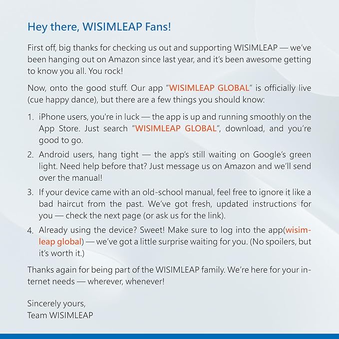 - 【Just for IOS phone】The app is up and running smoothly on the App Store. Just search "WISIMLEAP GLOBAL", download, and you're good to go. Android users, we didn't forget you,the app is still waiting for google paly approval ,if you really need, pls send email via amazon.