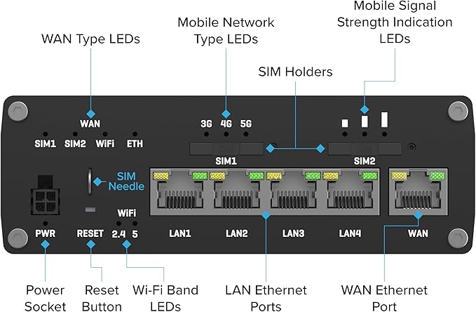 - Dual SIM Failover & Load Balancing – Ensures uninterrupted connectivity by automatically switching between two SIM cards and balancing network traffic.