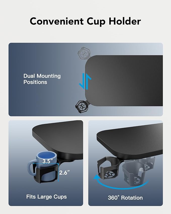 - Convenient Cup Holder: This adjustable overbed table includes a 360° rotating cup holder designed with two pre-drilled mounting holes, so you can install it on either side. Whichever way you sit or stand at the desk, you’ll have your cup in the right place and won’t knock it over with your elbow. When not in use, simply rotate the holder under the side table out of sight. It fits coffee mugs, water bottles, or even pen holders.