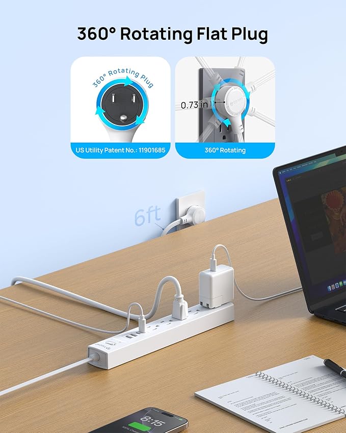- 360° Rotating Flat Plug: Featuring a 360° rotating plug design that breaks through the limitations of traditional plugs. It enables full-range free adjustment, effortlessly adapting to sockets at any tricky angle. With its slim 0.73in flat profile, this plug is specially designed for use behind furniture such as sofas, headboard, nightstands, and desks.US Utility Patent No.: 11901685