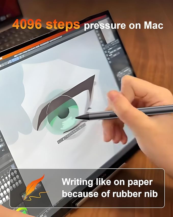 - [4096-Level Pressure-Sensitive Active Pen Support】 USI Protocol Capacitive Active Pen with 4,096 pressure levels (compatible with Windows & macOS). Delivers precise brush strokes, line weight variation, and eraser pressure control. Auto-adjusts pen pressure for natural writing and drawing. Optimized for Adobe Photoshop, CLIP STUDIO PAINT, and other major drawing.