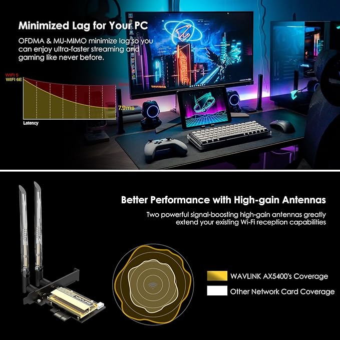 - 【Blazing-Fast WiFi 6E】Powered by Intel AX210, enjoy tri-band speeds up to 574Mbps (2.4GHz), 2400Mbps (5GHz), and 2400Mbps (6GHz) with 802.11ax tech (OFDMA, MU-MIMO, 1024-QAM, TWT) for lag-free streaming, gaming, and VR in crowded networks.