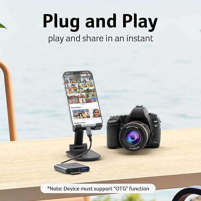 - 【3-in-1 Card Reader】The USB C SD Card Reader features dual card slots and a USB 3.0 port, enabling simultaneous data transfer from SD, microSD, and USB devices at up to 5Gbps. Transfer photos, videos, and files fast—no need to swap devices(📌Note:Thick cases may prevent full insertion)