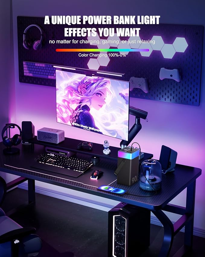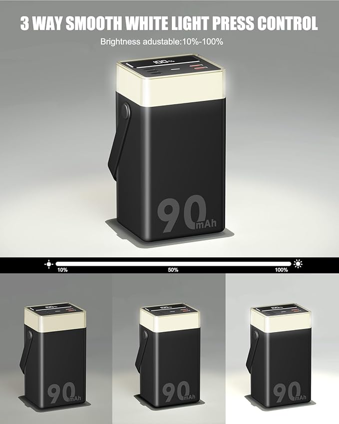 - 1. 4-IN-1 90000mAh Power Bank & RGB Mood Light & Table Lamp & LED Camping Lantern: Our power bank isn't just a 90000mahhigh capacity power bank, it also works as a RGB mood night light with 9 modes, table lamp with 3 modes, and outdoor LED Camping Lantern, emergency flashlight. Charge 5 Phones simultaneously; Built with UL-certified cells for safety and durability; Powers your smartphone about 10-20 times; Ideal for week-long camping trips