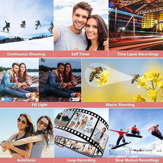 - 【Multifunctional Point and Shoot Digital Cameras】The 4k digital camera for photography is multifunctional in that it has four photo modes(Continuous shooting/Timed shooting/Auto photo mode/Normal photo mode)and four video modes(Time lapse recording/Loop recording/Slow motion recording/Normal video mode), along with a variety of filters. One camera can fulfill all your photography needs