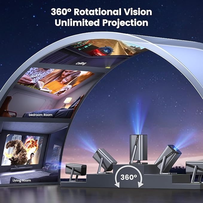 - 360° Adjustable Stand丨Unique Portable Design:Our ceiling mounted projector's 360° adjustable metal stand, combining stability to project perfectly from every angle. Weighing in at just 1.2kg, this sleek device, measuring 4.5 x 4.4 x 8.8 inches, is easy to carry with one hand. Its premium metal finish and compact design make it stylish and portable. With a 1/4'' screw hole on the bottom (Remove the bottom label to reveal), the video projector supports ceiling/wall mounting options. With a 1.1:1 throw ratio, it's capable of projecting a large screen from a short distance, ranging from 50 to 200 inches, meeting the entertainment enthusiasts for a portable and smart projector.
