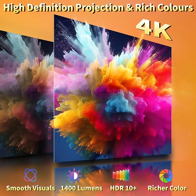 - 【High-Definition Video with 4K Compatibility】Featuring a 1920x1080 Full HD resolution and the ability to decode 4K Ultra HD videos, this portable projector employs advanced LED technology offering 1400 lumens and a contrast ratio of 10000:1. Whether enjoying films, TV series, or gaming, it provides an engaging visual spectacle, transforming your home into a cinema.