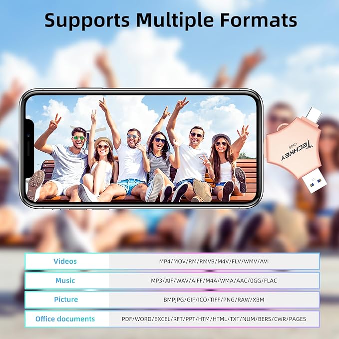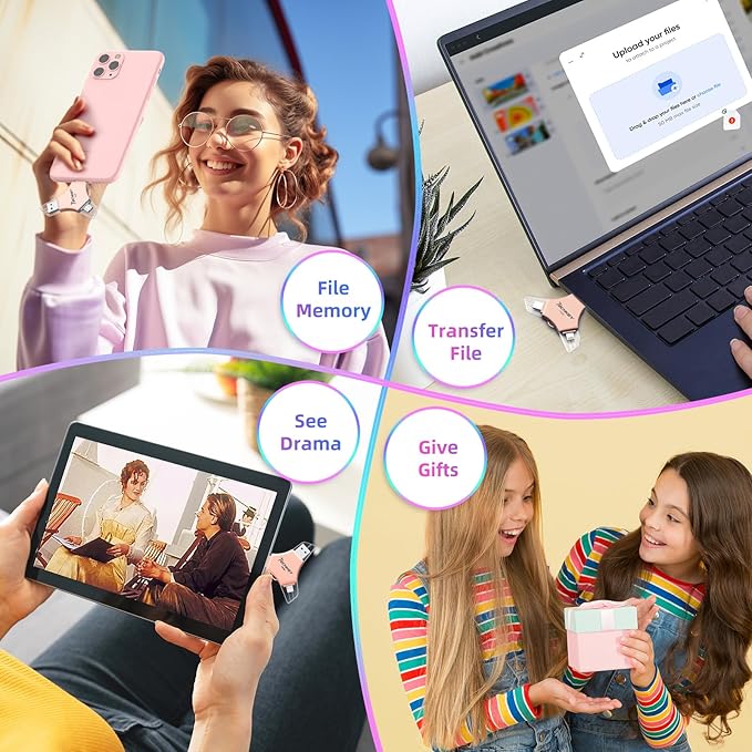 - 【One Click Backup, One Click Sharing】You can easily backup photos, videos, and phonebook to your phone with just one click via the APP, freeing up space on your mobile device without using a data cable or iCloud. You can also share photos/videos/files from the flash drive directly to social media (Facebook, etc.) for easy sharing with family and friends. (Tips: iOS devices need to download the "U-Disk" APP when using flash drive; Android and PC devices do not need to download APP)