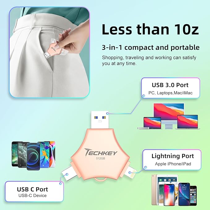 - 【512GB 3-in-1 Lightweight and Compact Memory Stick】The flash drive has USB/Lightning/Type C interfaces, compatible with iOS devices with iOS12.1 and above / OTG Android phones / PC with Win7 and above / MAC devices with MAC10.6 and above, convenient for data transfer between different devices. It is also lightweight and compact, easy to carry around and keep your data at your fingertips. Accompanied by a uniquely designed keychain, the product is more convenient for you to carry.