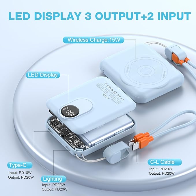 Small Magnetic Power Bank,5000mAh Mag-Safe Battery Pack with 20W Fast Charging Detachable USB C&iOS Cable,with LED Display,Slim Wireless Portable Charger for iPhone16/15/14/13/12 Series (Blue)