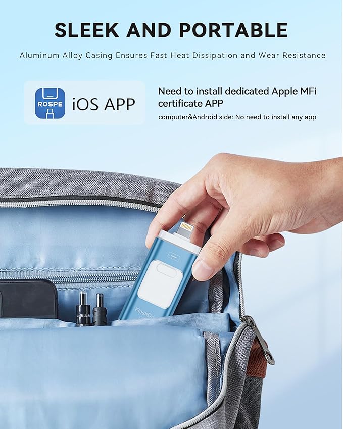 - Compact & Convenient: This MFi-Certified 512GB iphone photo storage stick helps you solve storage issues on your iPhone/iPad/PC, allowing you to easily back up your photos, videos, and phonebook with just one click using the app USB drive. (Note: To use this iphone memory stick on an iPhone/iPad, please download and install the "ROSPE" app from the App Store. For Android phones, simply enable the OTG function, no need to download any additional apps.)