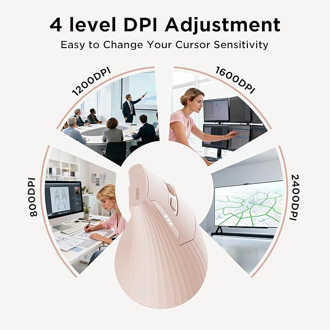 - 4-Level DPI Adjustment: It supports four DPI settings of 800, 1200, 1600, and 2400 for free adjustment. From documents and spreadsheets to design drawing or simple gaming operations. One mouse can meet the needs of multiple scenarios.this vertical mouse wireless offers the flexibility you need with just a click.