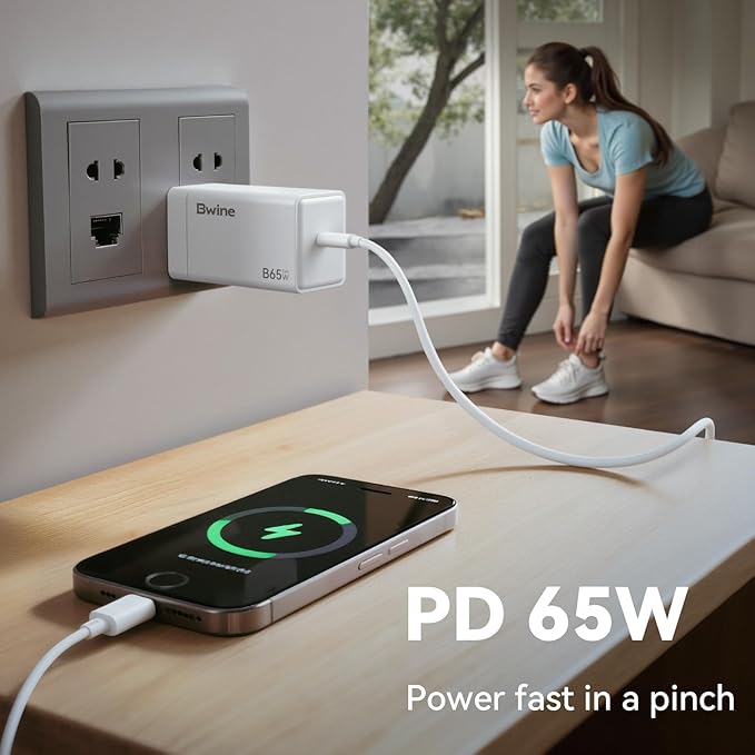 Bwine 65W Phone Charger, GaN Charging Blocks, Compatible with Drone, iPhone 17/Pro,Galaxy S24,Note 20/10+, iPad and More(1x Adapter 1x Cable)