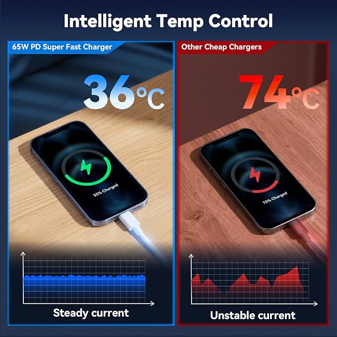- 【Safety Protection System】:Your safety is our top priority. This USB charger comes with robust safety protection functions, including over-current, over-heat, over-voltage, and short-circuit protection. It monitors temperature every 10 seconds to prevent excessive heat, allowing you to charge with confidence, even while you sleep.