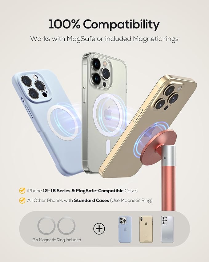 - Magnetic Metal Ring Included: Instantly convert any phone case to MagSafe-compatible. Works with Phone 13-17 Pro Max series, and all smartphones (Please wait 1+ hours after attaching the metal ring for full magnetic strength).