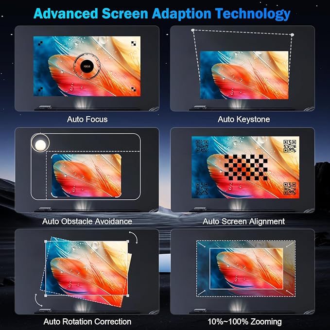 - 【Smart Screen Adation+100% Zooming+Game Mode+Sleep Timer】With advanced screen adaption algorithm, Home Projector can recognize movements and response accordingly with accurate and fast focus, obstacle avoidance, keystone, screen alignment and rotation correction fully automatic. This guarantees Portable Projector a perfect projection image shape from front/side/ceiling position. This ceiling projector has 10%-100% Zooming ability to adjust image size without projector moving. Game mode is designed to provide extreme low latency and smooth gaming projector experience. Sleep timer is a useful tool to set exact time to shut down the projector automatically in the movie night.