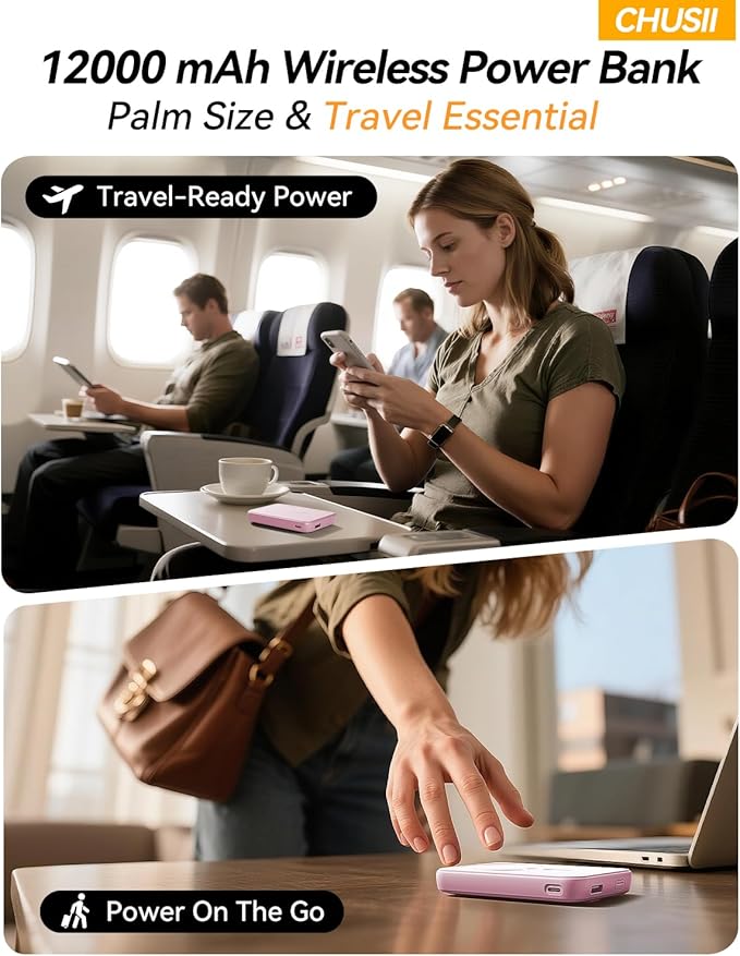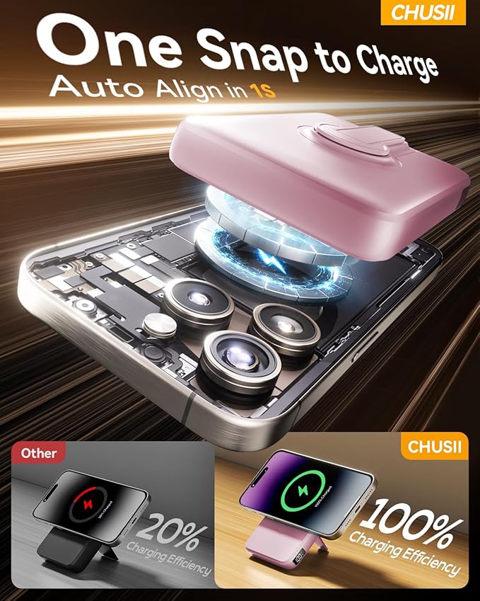 - Wireless Portable Charger- Not Constrained by βCableβ: CHUSII wireless powerbank is an ultimate go-to solution to reduce wire clutter and reduce the annoyance of plugging/unplugging charging cables. As soon as attach the battery pack, your phone recognises it and starts charging wirelessly. This feature has eliminated the hassle of dealing with loose cables and connectors, providing a seamless charging experience. The freedom it offers from wall sockets and cables allowing you to fully immerse yourself in an uninterrupted gaming experience