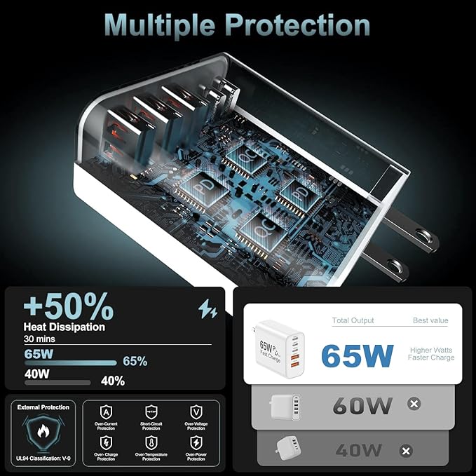 - 👍The USB C Charger supports the Power Delivery and Quick Charge 3.0 fast charging functions with a total power of up to 65W.The USB-A port offers an output power of 3 A/5 V,while the USB-C port offers a charging speed of 20W.Charge your iPhone devices from 0% to 60% in just 30 minutes