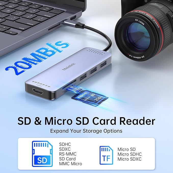 - USB C Card Reader & 100 W Power Delivery: This usb adapter for macbook support you to charging your laptop at power up to 100W while connecting multiple peripherals, no more power worries; Also with this mac dongle adapter multiport, you can conveniently browse photos instantly on your usb-c smartphones/laptops and transfer hundred images to your laptop in seconds.