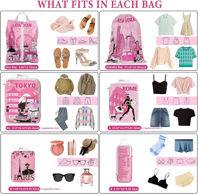 - 6 Packing Cubes: These travel packing cubes help you quickly sort items and keep everything organized! XL cube organizer (12.2"x16.14"x3.35"), L (10.24"x14.17"x3.35"), M (7.68"x10.24"x3.35"), S (4.72"x13"x3.35"). There is also a shoe bag (9.06"x15.75") and a laundry bag (17.13"x13.39").