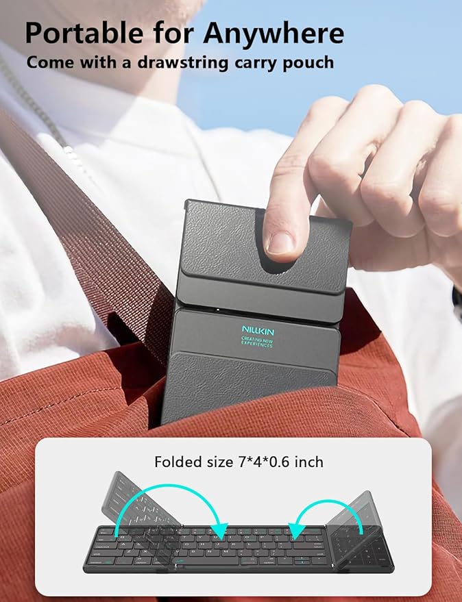 - 【Delicate Portable Keyboard】Equipped with environmentally friendly silicone anti-slip mats, made of ABS+PU material, no need to worry about daily wear or scratches. Comes with a velvet storage bag, the perfect companion for a folding keyboard. Not just a keyboard, but a travel solution!