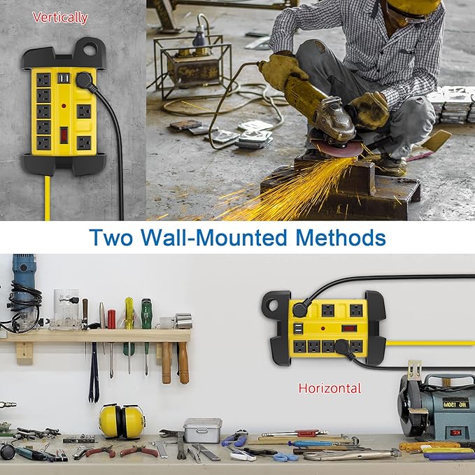 - Metal industrial power strip with yellow aluminum housing and black outlets, wall mountable and built-in usb ports design, perfect for hooking up all the gadgets at work.