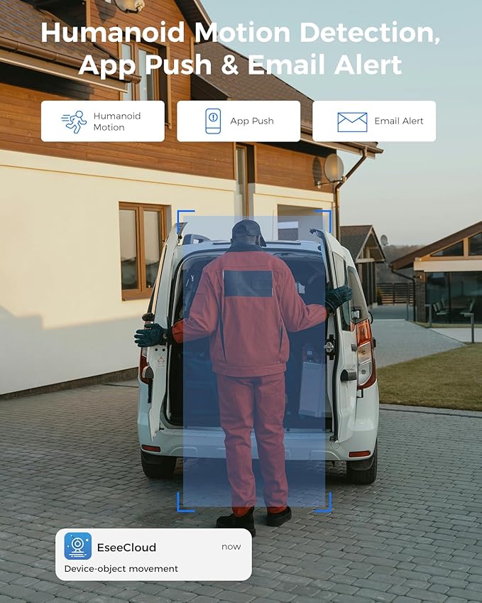 - 【Motion Sensor/AI Human Detection】 Motion detection of the wireless wifi security camera system give you 24/7 uninterrupted protection. Smartly distinguishes people from false alarms (like pets or shadows), sending alerts only for real threats by AI human detection.