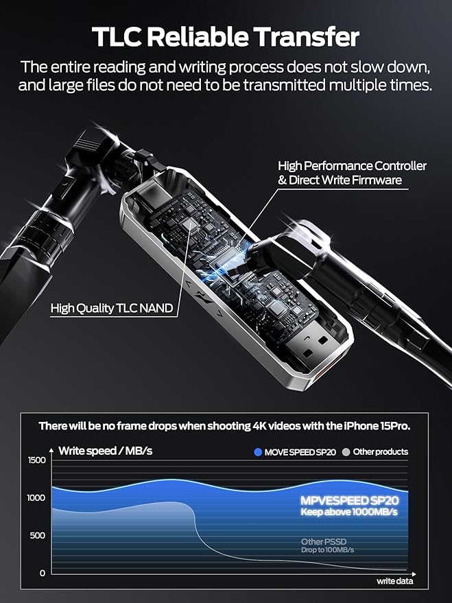 - 【4K ProRes】MOVE SPEED SP20 SSD provides 4K 60Hz ProRes HDR video capture for iPhone. This portable SSD can easily run on a variety of mobile devices, ensuring that it is always available in your pocket. (Device must support 4K, such as iphone15 Pro or later)