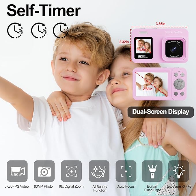 - UPGRADED 5K DUAL SCREEN DIGITAL CAMERA - Featuring 5K80MP high resolution, dual screen, autofocus, 18x digital zoom, face beauty function, and built-in flash