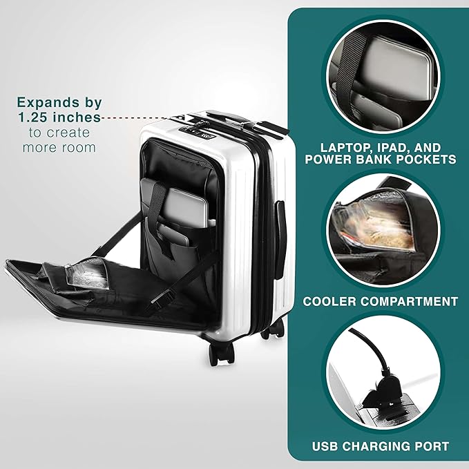 - 22 Inch Carry On Luggage: The carry on bag hard suitcase with wheels includes a padded laptop pocket, iPad pocket, and power bank pocket (power bank not included) that integrates with the exterior USB port to charge your devices; plus, an insulated food pocket.