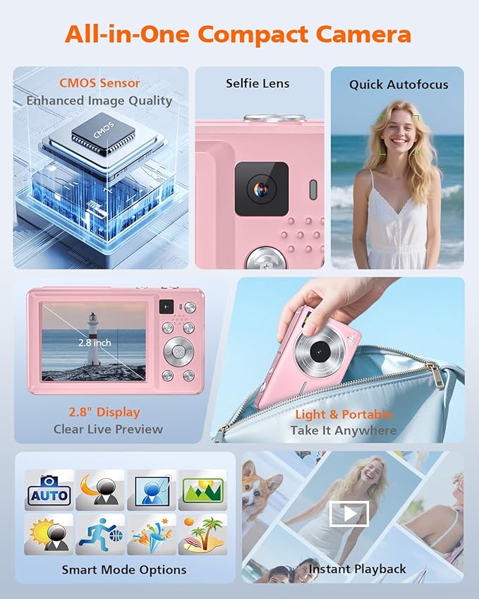 - 【Dual Cameras & Fast Autofocus】With both a rear and selfie lens, this compact digital camera is perfect for vlogging, selfies, and everyday shooting. Switch between rear and selfie lenses with a tap. The smart autofocus keeps your subject sharp, even in motion. Half-press the shutter to refocus and shoot with clarity. Whether you're new to photography or filming travel stories, this protable small digital camera delivers sharp, smooth results. Great for gifts, travel vlogs, and daily snaps