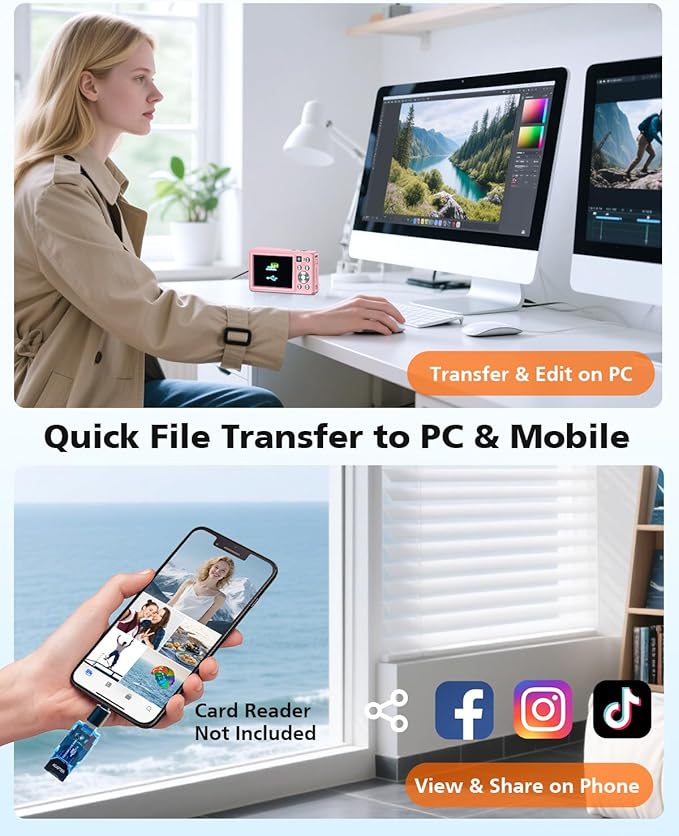- 【Fast Transfers & Webcam Mode】Capture now, share in no time. Use the included Type-C cable to upload directly to your computer, or connect the 4K video camera as a webcam for video calls, livestreams, or virtual classes. Just plug the digital camera into your computer, switch to Webcam mode, and you're ready to go. Great for online classes, video chats, and live sharing with friends or followers