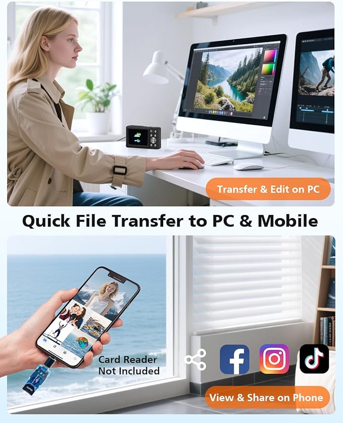 - 【Fast Transfers & Webcam Mode】Capture now, share in no time. Use the included Type-C cable to upload directly to your computer, or connect the 4K video camera as a webcam for video calls, livestreams, or virtual classes. Just plug the digital camera into your computer, switch to Webcam mode, and you're ready to go. Great for online classes, video chats, and live sharing with friends or followers