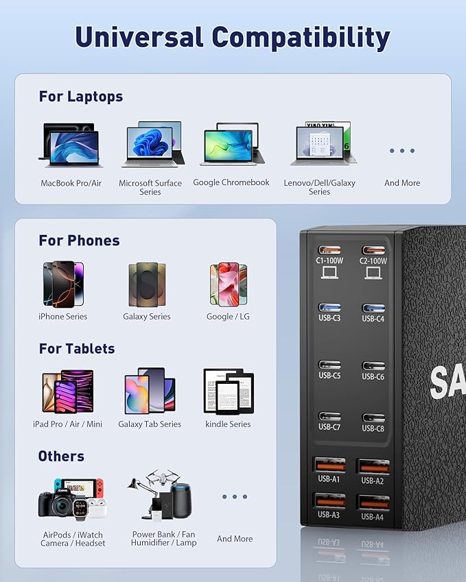 - 【Universal Compatibility】Our USB C charging station is equipped with 2*100W and 2*65W fast charging ports, which can charge 3 or more laptops at the same time. Compatible with smartphones, tablets and laptops, suitable for MacBook Pro/Air, Dell XPS, iPad Pro, Phone 16/16 Pro Max, Phone 15 Pro Max, Phone 14/13 Pro/12 Pro Max, iWatch, AirPods, Surface Pro, Galaxy S24 Ultra, Switch, Steam Deck, Google Pixel and many other devices.