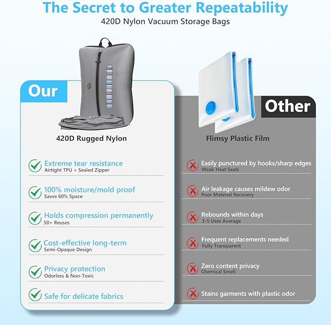 - 【Heavy-duty Construction】Constructed with 420D nylon & reinforced TPU, offering enhanced strength, increased durability, and superior tear resistance, allowing these travel vacuum bags to withstand 1000+ compressions
