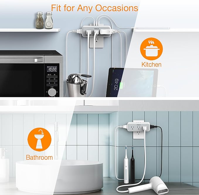 - Space Saving: Plug this multiple plug outlet on the top of outlet without blocking the other below, and create a charging station in your bedroom, kitchen, living room or any area with limited outlets