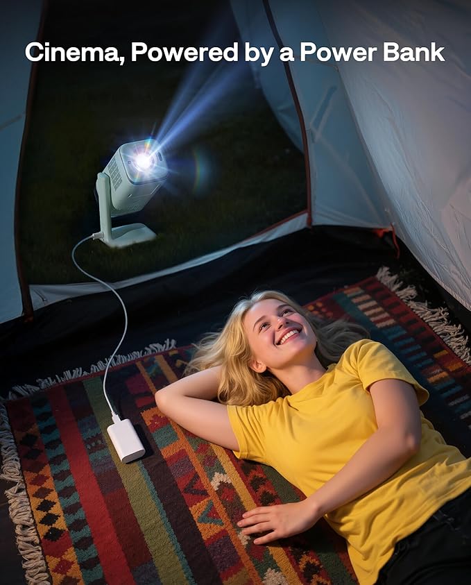 - Portable Design | USB-C Powered: This lightweight mini projector is as compact as an outdoor water bottle and runs on USB-C power (requires a power bank with 65W+ output for optimal performance). Whether it’s a backyard hangout, camping trip, or spontaneous NetfIix night, the BOOM Air portable projector brings the big screen anywhere, anytime—no outlets needed