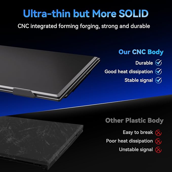 - 𝗨𝗹𝘁𝗿𝗮-𝗦𝗹𝗶𝗺 & 𝗣𝗼𝗿𝘁𝗮𝗯𝗹𝗲 𝗗𝗲𝘀𝗶𝗴𝗻: At just 0.63 inches thick and weighing only 1.76 lbs, this portable laptop monitor is thinner than most smartphones and lighter than most laptops. Its ultra-slim profile allows it to slide effortlessly into any backpack or briefcase, making it the perfect travel companion for digital nomads, business travelers, and remote workers who demand a truly mobile dual-screen setup without the bulk