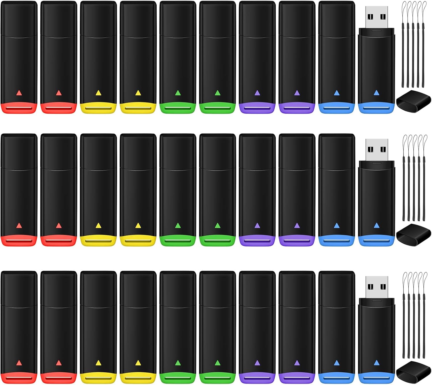 - What are you Get: 4GB USB Drive 50 Pack (mixed colors: blue yellow red purple green) and black lanyards. Note: The default format of the USB 4GB flash drive bulk is FAT32