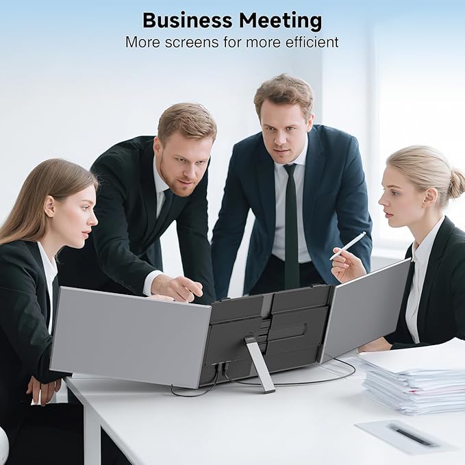 - 【Plug and Play】The laptop monitor extender is plug & play, no need driver. Each screen can rotate 0-180° freely, so you can adjust to your favorite angle when working or watching, and it will also protect your screen privacy in public areas. You can also choose Low Blue Light for eyes care. The rear tough strechable bracket of this laptop extended monitor portable can adjust the stability of the laptop and the screens. And it has a soft leather bag for protection when traveling