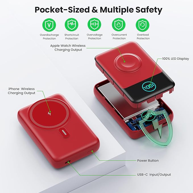 - 【3 Devices Fast Wireless & Wired Charging Power Bank】This battery pack features double-side magnetic wireless charging capability, Supports up to 15W for iPhone/Airpods and 3W for Apple Watch,USB-C Port up to 30W. Supports Fast charging up to 3 devices at the same time.With this powerful and fast-charging portable charger, you can power up all your devices efficiently and conveniently. (USB-C port support input/output)