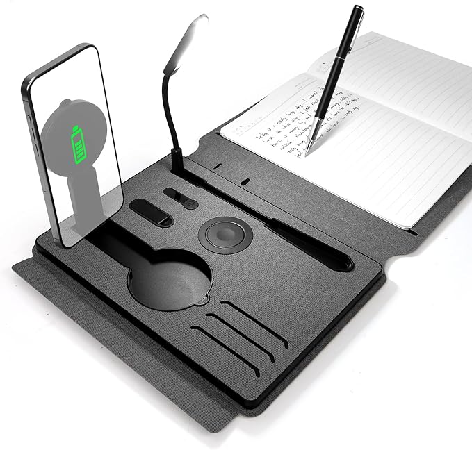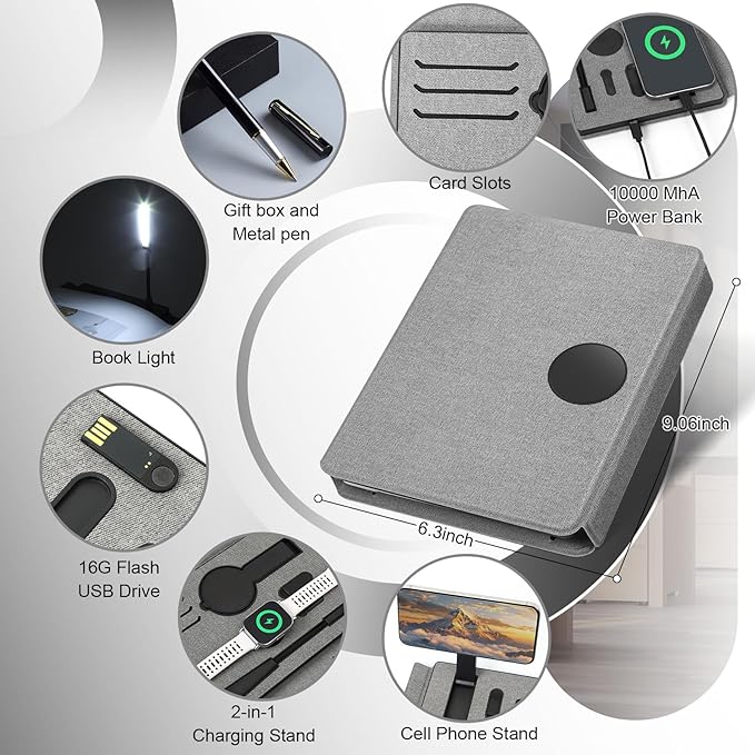 Travelers Notebook with book light,Travel Journal with 10000mAh Power Bank & 2-in-1 Wireless Charger,Hardcover Journal Set with Pen and Gift Box,Notebooks for Work,School,Travel,Business,Gift.