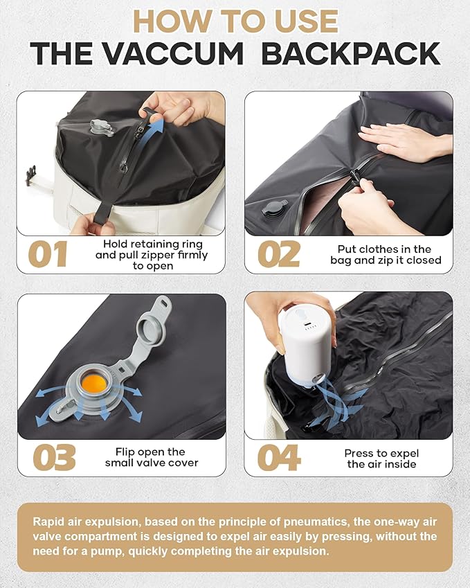 Vacuum Travel Backpack with Pump for Women,Personal Item Carry on Backpacks Flight Approved 18x14x8 inches for Men,Laptop Waterproof Work Compression bags Casual Daypack Beige.