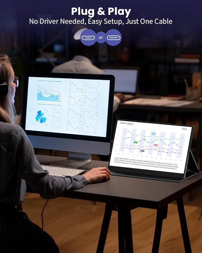 - 【Ultra-Slim Portable Display】 As a portable external monitor,ZUCWO portable laptop monitor features a 0.3inch ultra-slim profile(1.7lb).It is easy to accommodate to every suitcase and backpack and stress-free when you are holding it for a long time. No driver needed and equipped with 3.5mm audio inputs and 2 built-in stereo speakers to enhance entertainment experience.They are truly portable computer monitors for travelers, students, gamers,engineers, and everyone.