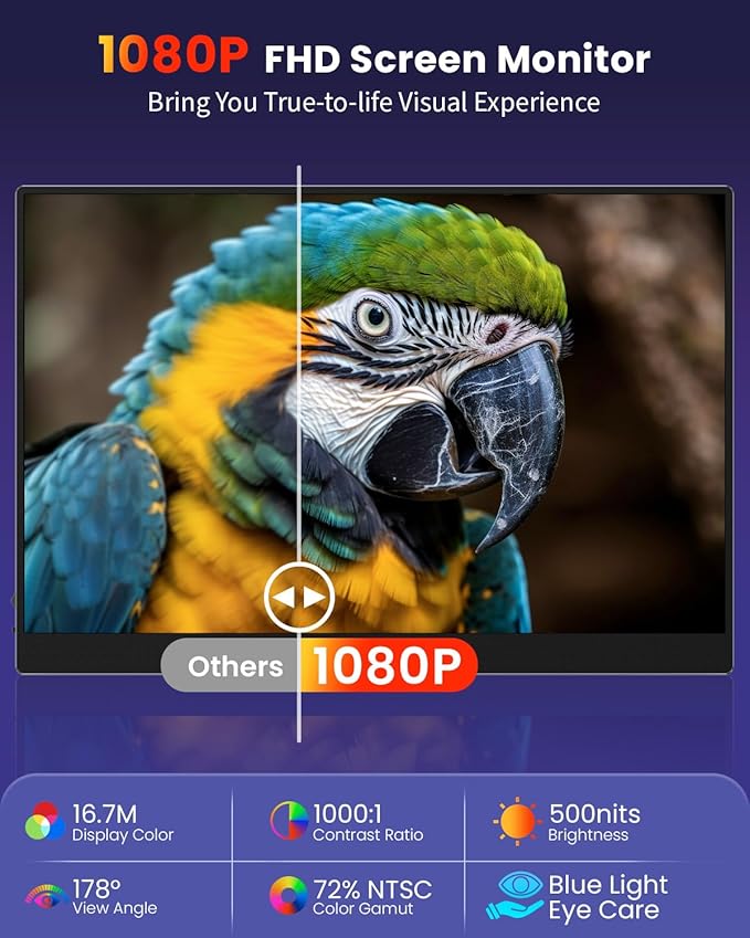 - 【Full HD Portable Monitor】ZUCWO 15.6inch portable laptop monitor with 1920*1080 resolution and HDR technology with 178°wide viewing angle,it renders accurate and bright color, draws you into the video or game with lifelike colors and amazing detail.It can effectively reduce blue light radiation damage, no flickering, eye-care, and make it easier to watch for a long time.