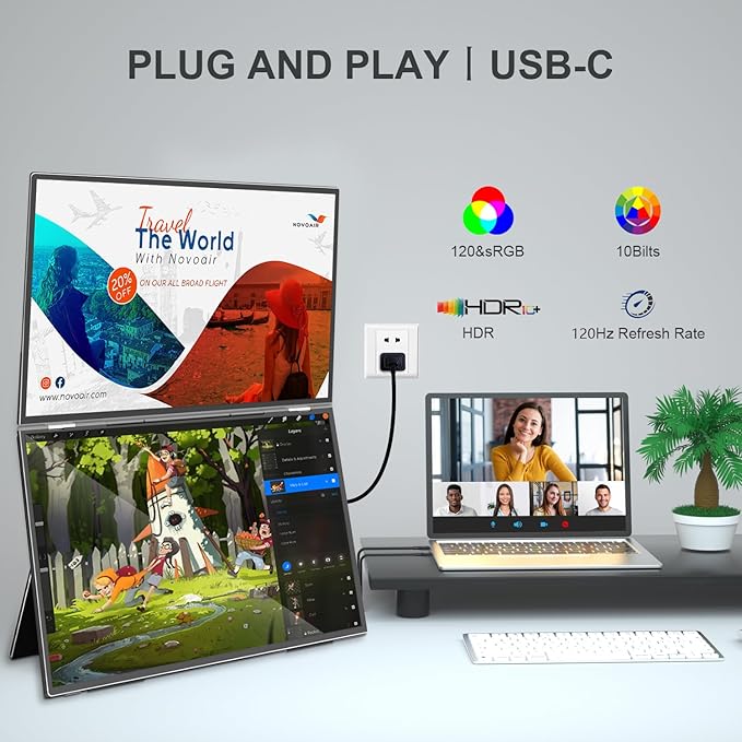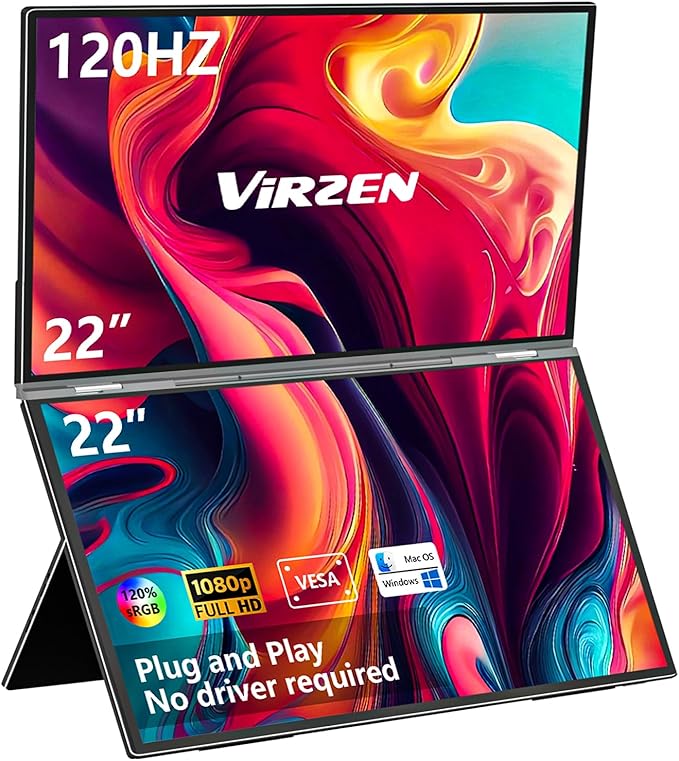 - Plug & Play – Virzen 22" Dual-Screen Foldable Monitor,True plug-and-play functionality, no drivers required. Fully compatible with Windows/macOS/Android/Nintendo Switch/PS5 systems. Includes USB-C cable, HDMI adapter, and DP-to-HDMI converter. The only dual-screen portable monitor supporting macOS ABC mode for triple-screen independent display.