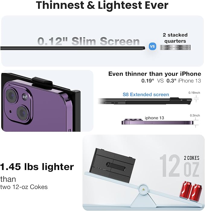 - [2025 Upgraded: Ultra-Thin & Ultra-Light! ]This Laptop screen extender is just 0.24-inch thick – thinner than your phone! Weighing only 1.45 lbs, it's a massive 30% lighter than before – lighter than two 12-oz Coke cans! This feather-light, ultra-slim design fits effortlessly into the included carrying case. Instantly boost productivity with extra display real estate anywhere.